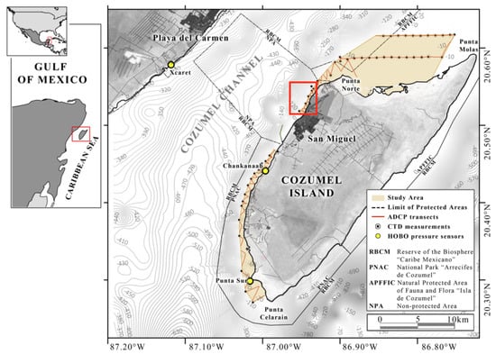 Cozumel Channel, Marine Protected Areas, bathymetry, and main urban areas. The red box shows the study area. Reproduced with permission from [6], MDPI, 2019.