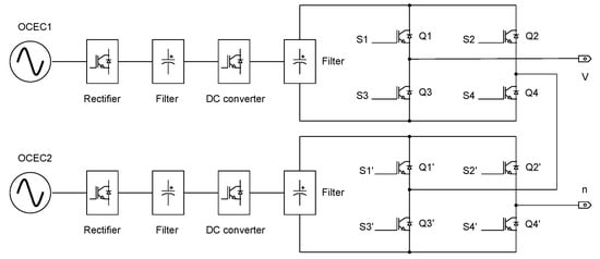 Figure 4 shows a 5-level single-phase CHBI used to harness the power generated by two marine turbines in isolation that can resist high operational voltage stress [41]. Between the OCECs and the inverter, a PWM rectifier and DC converter are considered.