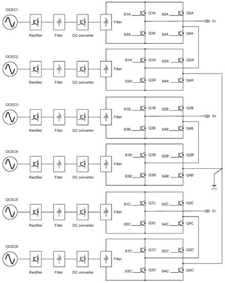 Figure 5 shows an example of a six turbine farm, connected to integrate a three-phase inverter cascaded by 5-level H-bridges. This design of this arrangement was based on the analysis of the study inverter configuration and the operation of the OCECs [41].