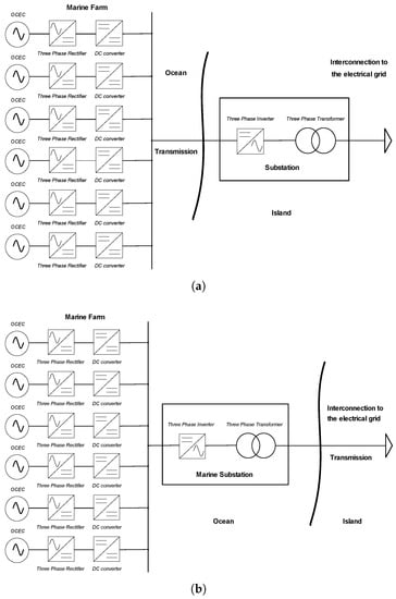 Examples of interconnection arrangements for a marine current generation system. (a) interconnection arrangement with power sub-station on land; (b) interconnection arrangement with power sub-station on sea.