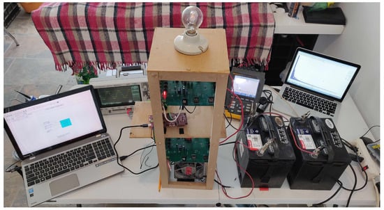 Due to the limited DC sources available in the laboratory, the inverter tests were not performed with their nominal values; as a result, heat sinks were not required for testing values, although they were considered for future inclusion in the PCB design. As shown in Figure 4, constant DC sources were used assuming an input with little change (standard requirements for interconnection of renewable sources to the grid). The power supply was two DC batteries of 12 y 550 A each. The testing included both resistive and inductive-resistive loads. The prototype inverter and the testing equipment are shown in Figure 7.