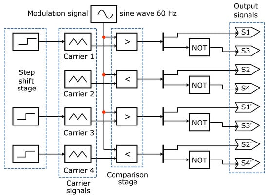 The representative control diagram for the LS-PWM control is shown in Figure 8, with the carriers ordered from top to bottom. According to the LS-PWM modulation, each carrier signal is displaced on a separate level of DC, with the amplitude of each modulation scheme defined by the used. In all the tests, a constant value of amplitude modulation was used , as this value was identified to produce lower harmonic component magnitudes. In this study, the analysis of phase shift and the frequency for each carrier signal with each control scheme was important. The control methods applied to the prototype inverter are shown in the following sections.