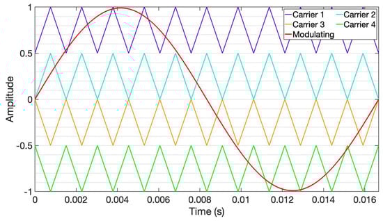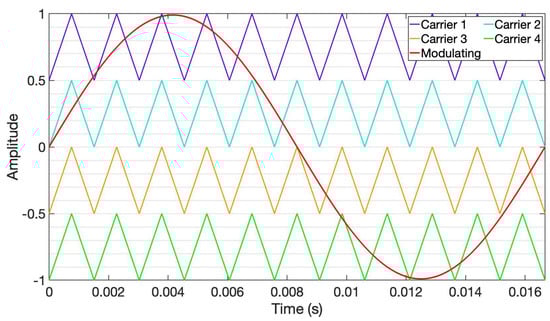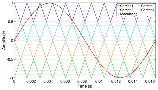 In this method of control, all the carriers are in phase () for the creation of the trigger control signals [13,14,15]. Furthermore, all the carriers above and below zero have the same frequency, amplitude, and phase, but a distinct DC offset (Figure 9).