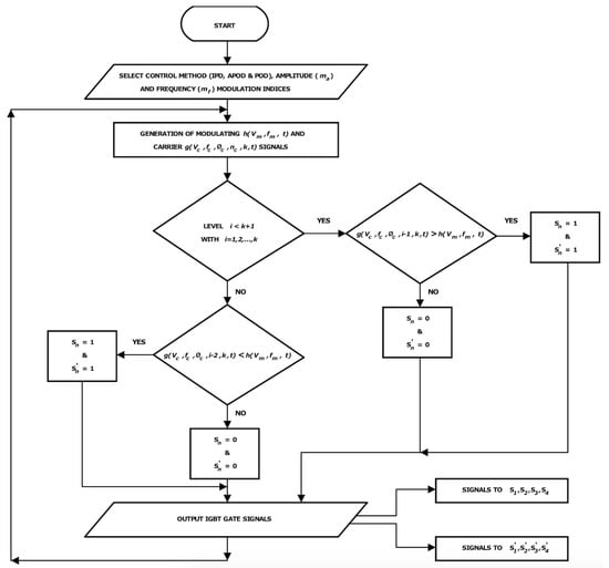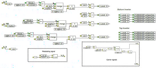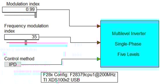 The inverter was controlled using a Texas Instruments® microcontroller TMS320F28379D and a 2019 student edition of SolidThinking Embed® software, which allows for the selection of , , and IPD, APOD, and POD controls. A flowchart of the proposed LS-PWM control algorithm is shown in Figure 12. The embedded scheme of the program is seen in Figure 13, and Figure 14 gives the block scheme of the control algorithm. This program uses fixed point type blocks for the variables.