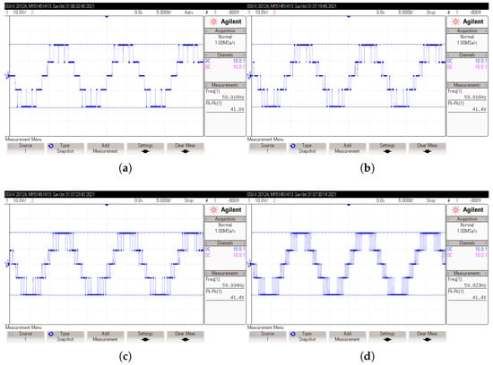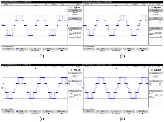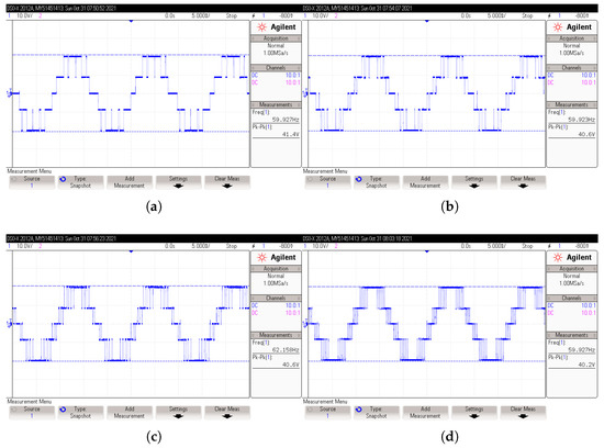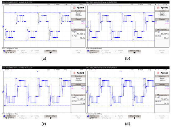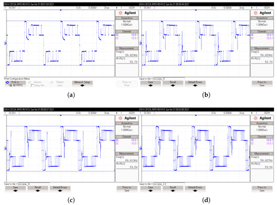 The results obtained in this work show an improved output voltage waveform and a reduction in the THD values, under the resistive and inductive-resistive load values considered when compared with those of [17,18,19,30,31,32,33,34,35,36,37,56,58], where other inverter topologies and PWM modulation methods were analyzed. It can be said that the implementation of the control scheme and the topology applied to the prototype are suitable for developing a practical three-phase inverter model.