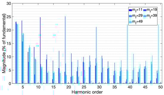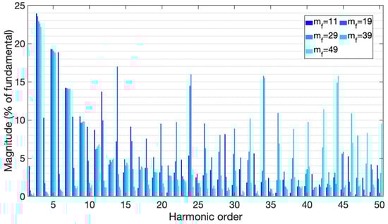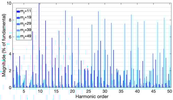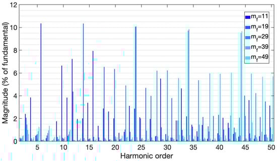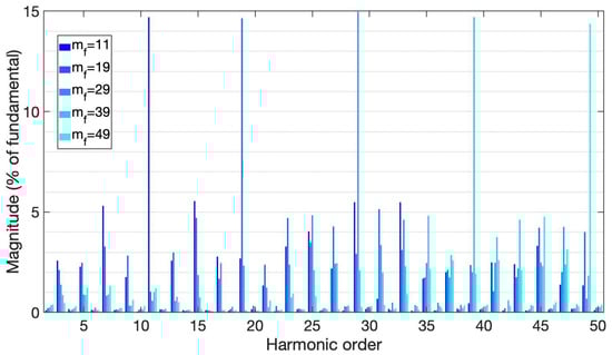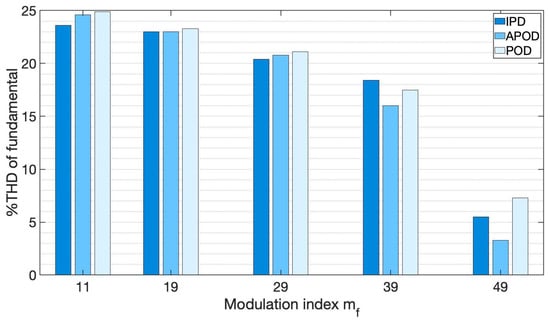 At , applying the APOD control, a THD of 24.6% was obtained. The overall THD fell to 3.3%t when the was increased to 49. However, when , the THD was 1% greater than when using the IPD control. Because lower frequency harmonic components were practically inconsequential, and the measurement instrument did not consider components beyond the fifteenth harmonic, this THD was the lowest of the three methods for high values. In this method, the even harmonic components had the highest magnitudes.