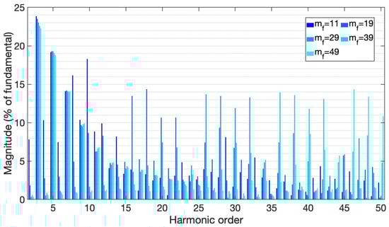 The direct examination of the harmonic components produced for each control approach was more complex; increasing the did not ensure a reduction in THD as occurred as in the previous instances. In IPD control, had a THD of 52.6%; however, when the was increased to 49, the total THD dropped to 37.1%.