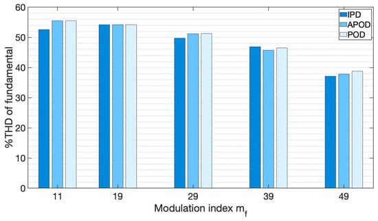 With the POD method, a THD of 24.9% was obtained with a value of . If , the total THD fell to 7.3%. Note that, in this method, the even harmonic components had the highest magnitudes. However, THD was higher than that in previous cases when ; 4% higher than the APOD method and 1.8% higher than the IPD method. It was thus evident that, in all three methods of analysis, the THD decreased as the value of increased.