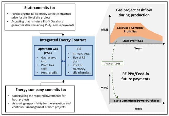 To overcome green financing constraints, the proposed integrated energy contract builds on the typical upstream gas PSC and adds a second dimension to tackle the renewable energy electricity project (Figure 1). The energy company provides the necessary investments for both projects, is responsible for their successful execution, and assumes full liability for managing their operations. The company can outsource some of the managerial or operational roles, but will always be the accountable party to the state. In parallel, the state commits to purchasing all the renewable electricity that will be produced throughout the life of the renewable project at the contractually agreed price. To de-risk the renewable energy project, the state offers its future Profit Gas share from the gas project as a guarantee that ensures that the company is paid for the renewable electricity it will be producing. At any point in time during the lives of both projects, the state is entitled to receive its Profit Gas share fully as long as the renewable electricity it is buying is paid for. If the state defaults on its payments at any point in time, then all the future state Profit Gas will be available to the company to collect its due payments. The mathematical definitions are provided in Section 3.