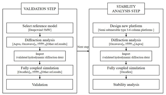 The present paper involves two main parts, code validation and hydrodynamic response and stability analysis as shown in Figure 1. Numerical analysis is usually based on mathematical models that describe the various physical processes involved in engineering applications. Code validation is one of the priorities of numerical simulation as it ensures the accuracy of the mathematical models. The NREL reference turbine, with a capacity of 5-MW supported with a semi-submersible OC4-OC4 platform, was selected for the validation test. Thereafter, diffraction analysis was performed in order to obtain the platform hydrodynamic characteristics, which were eventually used for fully-coupled simulation in the final stage. The hydrodynamic behavior of the platform was predicted based on its characteristics. Thus, it was essential to determine the platform characteristics in order to accurately capture its hydrodynamic performance. Two commercial tools ANSYS-AQWA and Orcawave, were adopted in the present work to conduct the diffraction analysis and to obtain the OC4-OC4 platform characteristics. The reasons for using various tools for diffraction analysis are explained as follows. To perform fully coupled simulation with the Orcaflex tool, there is a need to input the diffraction data required for platform analysis. Orcawave enables the generation of diffraction data and the easy importation of the generated data. However, in the Orcawave tool it has been confirmed that sometimes a result does not converge even if the size of the grid becomes smaller. Therefore, when the convergence of the results was not guaranteed using the grid sensitivity test, ANSYS AQWA, another diffraction analysis tool, was used to secure the reliability of the analysis.