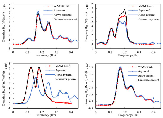 Figure 3 displays a comparison of the hydrodynamic behavior in terms of the damping coefficients of different matrices (, , and ) between the present results obtained from AQWA and Orcawave and the corresponding published data. Overall, the results show good agreement between the results obtained from both AQWA and Orcawave and the corresponding data from previously published work [16]. However, slight discrepancies were captured between AQWA and Orcawave, particularly for the damping matrix , which is due to the different approaches used to estimate hydrodynamic diffraction.
