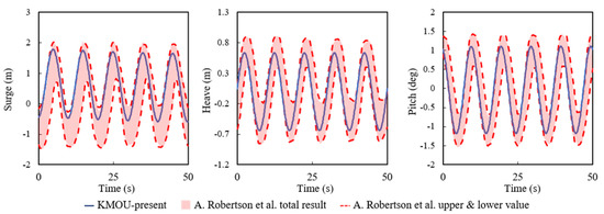 Figure 4 shows the simulation results for the surge, heave and pitch motions considering the regular wave condition without wind. These simulations were performed with a wave height of 6 m and a wave period of 10 s. The blue line represents the present results, while the red area represents the simulation result performed by A. Robertson et al. [10]. They obtained their platform motion results using various simulation tools; however, these graphs show only one region for the sake of clarity. Moreover, the upper and lower regions of the reference result zone are displayed with a red dotted line. In Figure 4, it can be seen that the present result are in agreement with previously published data under regular wave conditions.