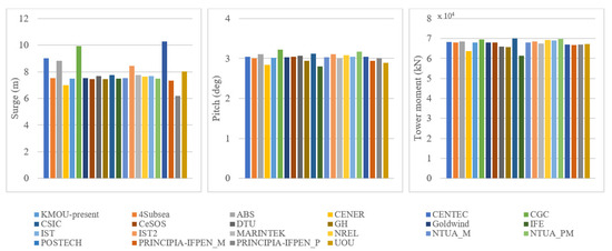 The simulations were performed under the above-mentioned environmental conditions. Moreover, we compared surge, pitch, and tower moment values with other researchers’ simulation results from different tools under the same environmental conditions, as displayed in Figure 6. Other research organizations’ exact names are displayed in the index, and they are referenced along with the paper by A. Robertson et al. [10].