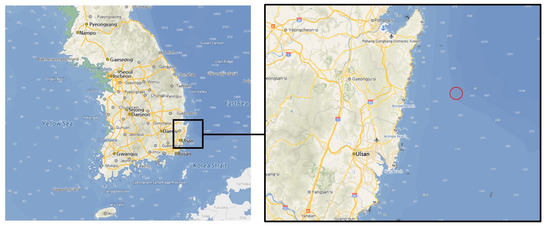 Platform stability analysis simulation by shape was performed by applying extreme environment data from , Ulsan waters, located off eastern Korea. This location is displayed as red circle in Figure 7. The extreme environment data used in the simulation made use of the 2019 deep sea design wave data provided by the Ministry of Oceans and Fisheries; only wave height, wave period, and wind speed data for each direction were used. In order to analyze the overall stability of the platform with DLC, the influence of waves and winds in all directions was analyzed. In addition, in order to understand the stability of the wave and wind misalignment conditions three cases of wind misaligned by 22.5° left and right based on the direction of the aligned wind and wave direction for each wave condition were carried out for each platform, for a total of 48 cases per platform. Simulations were additionally performed for the collected ten-year environmental data; the NNE direction with the strongest wind speed was set as the wind blowing in front of the turbine. The applied environmental conditions and locations are explained in detail in Figure 7 and Table 2 and Table 3 below.
