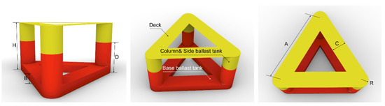 Figure 8 shows a platform with three columns as an example along with the names of the parts of the platform and the parameters considered in the design. The base ballast tank was set to 5 m in consideration of the amount of material used in platform manufacturing while allowing enough ballast water to be filled. The width of the deck was designed similar to that of the diameter of the column such that the width of the deck was changed as the diameter of the column changed. As the purpose of this study was to compare and analyze the stability according to the number of columns with the amount of materials the same, the column radius was selected as a factor that inevitably had to be changed in order to maintain the same amount of materials used. Drift was set to 20 m, the same as the standard without the number of columns, and the height of the platform was set to 32 m; the location of the fairlead was set to 6m from the bottom of the platform, the same as the standard. Shape information for each platform is shown in Table 4.