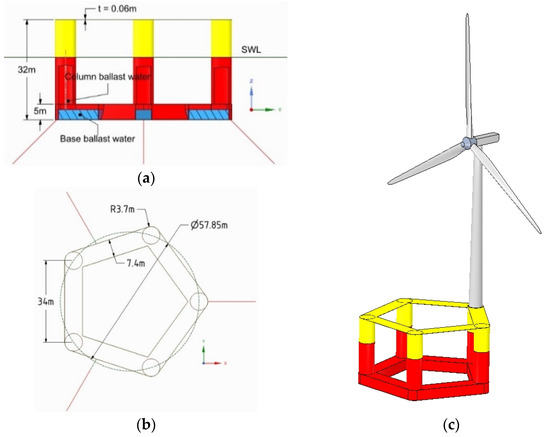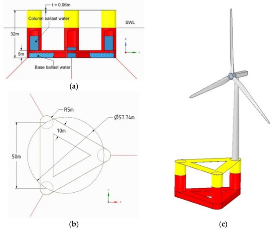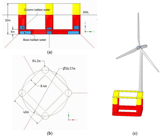 Generally, full-scale floating wind turbine testing is more expensive and most of the analysis data are confidential and not available to researchers. However, a few experimental tests have been performed with scaled-down models using wave tanks. Moreover, several design codes and numerical tools have been created over the years. Allen et al. [11] conducted a study to verify simulation reliability by comparing the experimental results of scaled-down floating turbines with the corresponding data from numerical analysis. Robertson et al. [12] compared the accuracy of various numerical codes by conducting a simulation of a floating turbine under the same environmental conditions. Several topics can be addressed in the platform design. Zhou et al. [13] reported the manufacturing cost, structural characteristics (stiffness and natural frequency), and hydrodynamics varied according to ten shape design variables for a semi-submersible platform having a simple shape with four columns (the concept presented by NAUTLUS); AAT sensitivity analysis was used to conduct the platform optimization work.