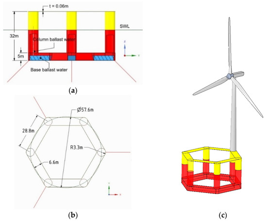 The density of the material used for the platform was 7850 kg/m3. The characteristics and the center of momentum derived using the Equations (9)–(16) are shown in Table 6 for each platform. The center of mass shown in Table 6 is defined based on the water surface and the weight of the tower rotor, nacelle, mooring, and ballast water. The ballast water mass is calculated in order the platform can be horizontal to the sea level when all parts (tower, rotor nacelle assembly, and mooring) are bonded to the platform. Once the ballast water is determined as follows, the inertial moment value required to derive the hydrodynamic data of the platform can be obtained; these values are shown in Table 7, Table 8, Table 9 and Table 10. The moment of inertia provided in these tables considers the tower, RNA, mooring, and ballast water.