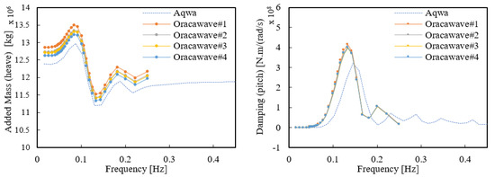 As for the grid size, the platform was constructed with a finer grid as the number went up from #1 to #4. In the case of AQWA, because there was negligible difference in the diffraction result values for each grid size, only one grid result was used in this paper. In the case of three columns as Figure 14, the added mass value for the peak was predicted to be low overall according to the wave cycle using the rough mesh size. However, the added mass values for different mesh sizes were confirmed to match, having almost no difference. The added mass derived through AQWA, which was lower than Orcawave, was generally confirmed. In the case of damping, the damping value for pitch was low in Orcawave analysis with rough mesh, while the other mesh size showed no difference in value. AQWA was derived with damping values entirely off-set to the right, while peak values had mostly similar values to Orcaflex.