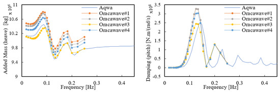 Diffraction analysis is used to estimate the hydrodynamic loads on a floating structure due to excitation from incident waves. A comparison of the hydrodynamic coefficients of a semi-submersible platform including added mass and damping coefficients was performed between the potential codes (Orcawave, WAMIT, and ANSYS-AQWA). Overall, the results obtained from Orcawave and AQWA in terms of the added mass of different matrices (, , and ) showed good agreement with the corresponding data from previously published works, as depicted in Figure 2. However, there was an evident difference in the added mass matrix () between potential codes AQWA and Orcawave. In this respect, Lin et al. [15] mentioned that a slight difference in added mass between potential codes could be due to different approaches used to estimate hydrodynamic diffraction. In any case, the overall hydrodynamic behavior of the floating platform was not affected by these slight differences.