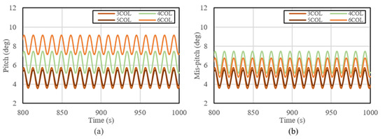 Figure 18, Figure 19 and Figure 20 show the fully-coupled simulation results under the most critical environmental conditions. Figure 18a, Figure 19a and Figure 20a show the platform motion results simulated under a regular wave with a wave height of 7.4 m, wave period of 12 s, wind speed of 23.1 m/s, and the direction of waves and wind aligned. Figure 18b, Figure 19b and Figure 20b show the platform motion results simulated under a regular wave with a wave height of 7.4 m, wave period of 12 s, wind speed of 20 m/s, and the direction of waves and wind misaligned. Figure 18 shows the surge motion results for four different types of platforms. From this figure, it can be seen that the different types of platform had almost the same surge motion under both aligned and misaligned environment conditions. Figure 19 shows the heave motion results. In the case of heave motion, a slightly different minimum and maximum were confirmed depending on the platform type. The three-column platform’s maximum heave value was 1.3 m, and the minimum heave value was −2.6 m. The four-column platform’s maximum heave was 1.3 m, and the minimum heave value was −2.1m. The five-column platform’s maximum heave was 0.5 m, and the minimum heave value was −2.3. The six-column platform’s maximum heave was 1.5 m, and the minimum heave value was −1.2 m. Considering the average value, the six-column platform moved the least and the three-column platform moved the most. For amplitude, the six-column platform’s amplitude was the least at 2.7 m and the three-column platform’s amplitude was the highest at 4 m. Figure 20 shows the platform pitch motion results. Contrary to the above two results, the motion was different between the aligned and misaligned environmental conditions. In aligned conditions all platforms’ pitch motion amplitude was almost the same, although the averages were different depending on the platforms. In the cases with three and five columns the platform was the most stable, while the six-column platform was the most unstable. In misaligned conditions, all platforms’ pitch motion was almost the same as in the aligned conditions, except for the six-column platform. In case of the six-column platform, the average was more stable compared to the four-column platform.