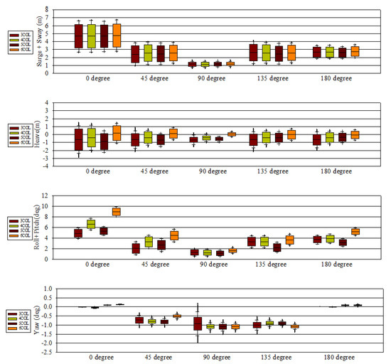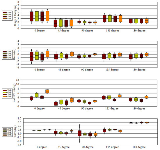For surge + heave, there was no overall difference in platform shape and the largest range of behavior was found in all platforms from 0 degrees to about 2.5 m to 6.5 m, followed by a similar range and average values at 45 degrees and 135 degrees; the average value was similar, and the range of behavior was more stable. The smallest range of behavior was 90 degrees, the absolute sum of surge + sway was about 1 degree on all platforms, and the maximum and minimum range of behavior was confirmed to be within 1 degree.