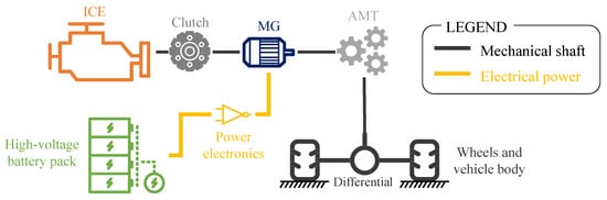 Figure 2 illustrates the representative parallel P2 full HEV powertrain architecture retained in this study, while Table 1 lists all the corresponding relevant parameters. In this parallel P2 HEV powertrain, the electric motor/generator (MG) is placed between the ICE and the automated manual transmission (AMT) gearbox. A clutch connection is included between ICE and MG. Both ICE and MG can directly deliver tractive power to the driven wheel shaft. Two variables need to be controlled in the parallel P2 HEV powertrain retained in this work. They particularly relate to the gear number to be engaged in the AMT and to the torque split between ICE and MG. This latter control variable here corresponds to controlling the ICE torque. Indeed, in a backward HEV modelling approach such as the one described in sub-Section 2.2, controlling the ICE torque allows for automatically determining the value of MG torque required to comply with the instantaneous driver’s torque demand.