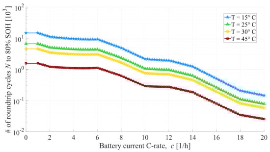 As mentioned earlier, the battery is assumed here to reach the end of life (i.e., SOH = 0) when 20% of its initial capacity is lost. Therefore, the overall value of can be set to 20% and can be determined as a function of c and T using Equation (7). Subsequently, the total number of lifetime roundtrip cycles can be calculated using Equation (8):