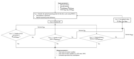 The SRDP approach receives as input, other than the HEV powertrain parameters and the driving mission under analysis, , , , and . , and are scalar coefficients that tune the ICE cranking frequency over time, the gear shit frequency over time, and the severity of the battery ageing resulting from the control actions performed, respectively. Values of , and are all initialized as 0 at the beginning of the SRDP workflow illustrated in Figure 4 not to excessively deteriorate the estimated fuel economy during the first iteration of the algorithm. Then, their values will be iteratively updated to meet HEV control optimization constraints in terms of smooth driving and battery lifetime, as will be described below for Step C.