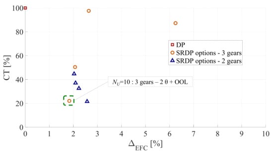 Pareto frontier for options of SRDP control variable set in terms of WLTP estimated equivalent fuel consumption percentage increase () and percentage computational time (CT) compared with DP.