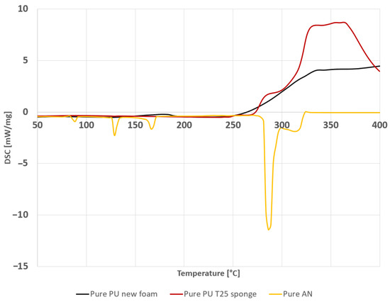 Figure 2 shows the DSC curve of pure AN (as a control) along with pure PUR foam to distinguish which peaks derive from which components.