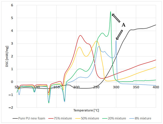 For the remaining samples, it is noticeable that in the course of the decomposition reaction, two stages of the decomposition reaction were observable. In addition, the amount of heat released during the reaction changes. In this case, the highest enthalpy can be observed for the decomposition process of the mixture containing 20% of the polymer, which was higher than in the case of the new foam (