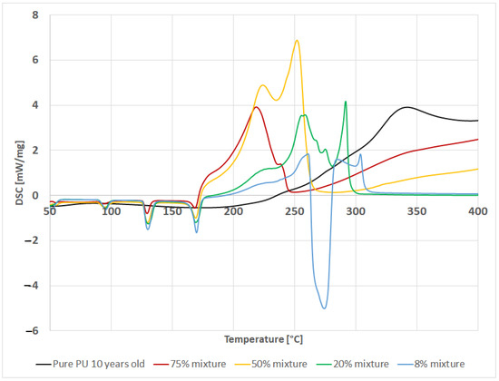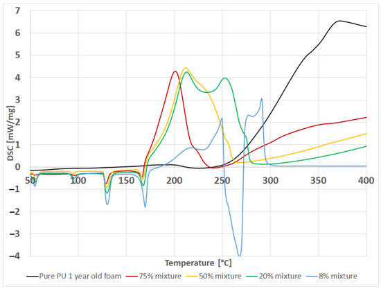 The results obtained for the ten-year-old insulating foam show some similarity to the one-year-old foams. In this case, no potentially explosive reactions were observed, although at times the course may be quite rapid (>284 °C). The course of the decomposition reaction for mixtures containing 75% and 8% of polymer was very similar for mixtures based on one-year-old foam, while in the case of mixtures containing 50% PUR this behavior resembled the decomposition process of new foam. It is also worth noting that, in contrast to the previous mixtures, the highest reaction enthalpy, i.e., −1370 J/g, was recorded for the mixture containing 50% of polymer (