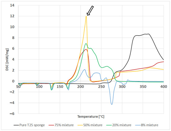 The behavior of the 8% mixture was relatively similar. One can observe peaks indicating a similar course of the decomposition reaction. However, the temperatures at which similar processes probably take place change significantly. While the course of the AN melting reaction was almost identical, the decomposition of the mixture itself was much smoother, additionally illustrated by the lower reaction enthalpy value of −878 J/g (