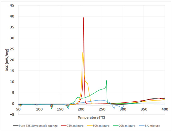 In the case of the one-year-old foam which was taken from the area of its application, no potentially explosive reaction was observed for any of the analyzed mixtures. It is slightly different compared to the new foam. In particular, a mixture containing 8% of polymer was distinguished, whereby—during decomposition—an endothermic process could clearly be seen, which probably results from the thermal decomposition of AN. Apart from that, for this mixture, we can see that the remnants of the exothermic process occurred at the end of the decomposition reaction, however, unlike the sample with the new foam, due to the relatively low amount of heat released, it did not carry the risk of explosion (