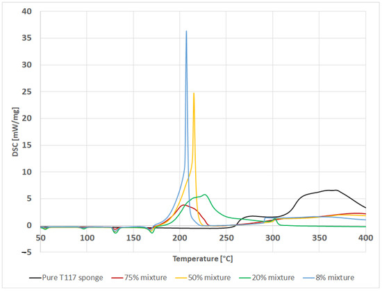 Another sample analyzed is dense T117 foam. In this case, quite an unusual course of the processes taking place in a function of temperature and dependent on the polymer content in the mixture was noted. We observed the explosive nature of decomposition for 8% and 50% samples. It is worth paying attention to the similar course of the mechanism in both cases. First, there a rapid decomposition reaction occurs, followed by an explosion of the mixture. However, for the 20% mixture and the 75% mixture, the decomposition was found to be relatively gentle. This is practically the first DSC course of this nature. The reactions for both mixtures differed in the heat effect and the explosion temperature. However, attention should also be paid to the relatively large amount of heat released in all cases (