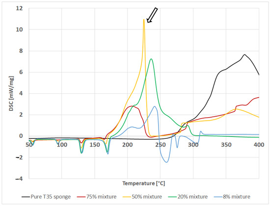 The use of T35 foam and charred insulation foam. Due to the DSC diagrams obtained for ordinary foams and sponges, it was decided to test the behavior of the mixture of AN with char produced from the above-mentioned samples. The samples were placed in an oven heated to 350 °C for 10 min. Then, they were cooled and grinded in an inert gas atmosphere not to react with oxygen and water contained in the air. Then, the samples were prepared in the same way as described earlier.