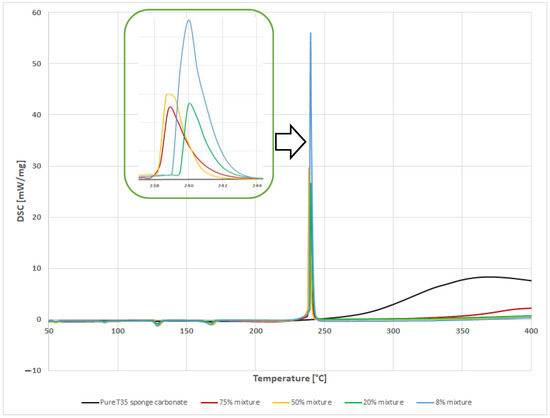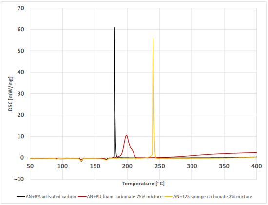 Figure 10 shows a comparison of the 75% mixture with the strongest mixture obtained for the T35 foam char and the mixture with activated carbon in the proportions of 8%. In the case of char obtained from the insulating foam, a decomposition reaction of an inexplosive nature can be observed. The decomposition reactions for the AN mixture with char obtained from T35 foam and with the chemically pure activated carbon in the amount of 8% proceed in a very similar way, but they differ in the thermal effect. It is worth noting that there is a significant difference between the temperatures—the explosion in a mixture with pure carbon takes place approximately 60 °C earlier (