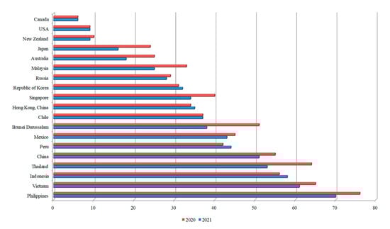 Asia-Pacific Economic Cooperation (hereinafter APEC) member economies were used as an object of the study. APEC currently includes 21 member economies. They are as follows: Australia, Brunei Darussalam, Canada, Chile, China, Hong Kong SAR (China), Indonesia, Japan, the Republic of Korea, Malaysia, Mexico, New Zealand, Papua New Guinea, Peru, Philippines, the Russian Federation, Singapore, Chinese Taipei, Thailand, the United States of America, and Vietnam. APEC is one of the few international associations to which Taiwan has joined with the full approval of China (in our study it will be referred to as Chinese Taipei). Therefore, APEC adopted the term “member economy” instead of “member country” [] (pp. 110–120).