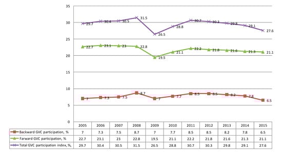 - The share of a country’s national (domestic) value added arising from its own exports (direct and indirect through the exports of other domestic industries) included in exports of other countries, i.e., the forward GVC participation. This is an indicator of the country’s value added that is not consumed directly at the export destination, but is re-exported. A high level of the GVC participation means that the country exports more intermediate goods and services used for the export of other countries [] (pp. 589–606).