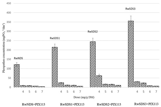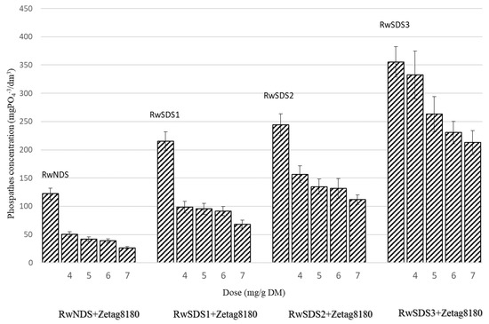 - The phosphate concentration in the reject water obtained from sonicated sludge increased along with the increase of the ultrasonic field’s amplitude. However, it decreased with the increase of the dose of chemicals agents added to the sludge. The lowest value of phosphate concentration (4.3 mgPO4−3/dm3) was observed for the reject water from non-sonicated sludge prepared with PIX 113 at a dose of 7.0 mg/g DM.