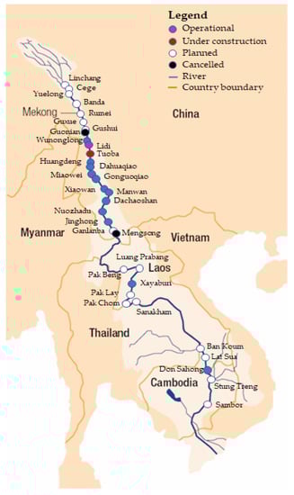- Biba, S. China’s Continuous Dam-building on the Mekong River. J. Contemp. Asia 2012, 42, 603–628. [Google Scholar] [CrossRef]