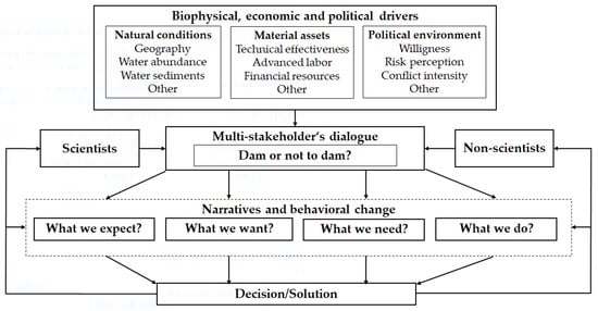 Yet, instead of elaborating the importance, capacities and responsibilities of the relevant multi-stakeholders involved in the decision-making process [,,], we briefly designed the conceptual scheme explaining the key aspects affecting the behavioral change towards hydropower development (Figure 3). First, there are the biophysical, economic and political drivers that stimulate multi-stakeholder dialogue and indicate if it is feasible to build or not to build the particular water project []. Second, there are the inputs from the scientists and non-scientists that determine the fate of the proposed hydropower project. During the negotiation, the multi-stakeholders express different expectations, formulate various demands and demonstrate multiple needs to safeguard their interests []. Although the material, bargaining and ideological powers among multi-stakeholders significantly vary [], it is the actor’s performance and form of communication that justify whenever the ratio between the tangible benefits and potential costs is politically acceptable. Third, regardless of the decision of the policy-makers and planned itinerary of the dam construction, any water infrastructure project can be potentially re-designed, postponed and even cancelled according to the actual needs and demands of the multi-stakeholders. However, once the hydropower dam is completed, the potential decommissioning of the hydropower projects can be politically, economically and ecologically troublesome, especially for developing countries, which may not be able to afford to cancel the existing contracts [,,,].