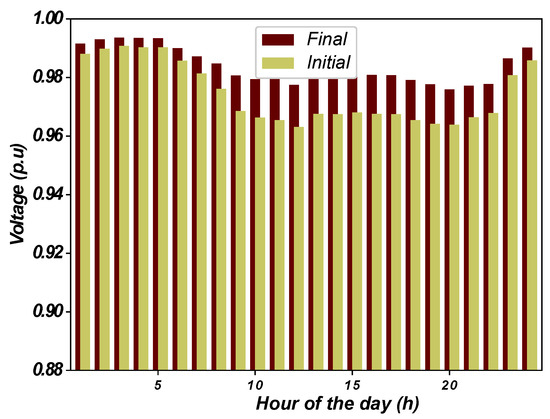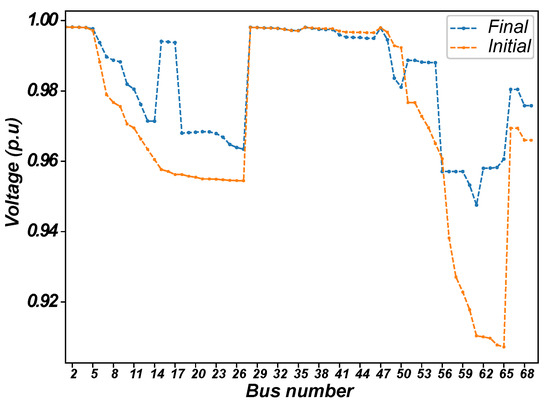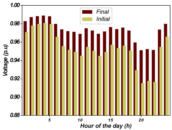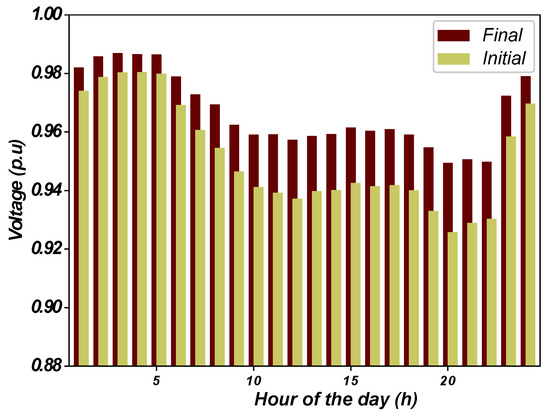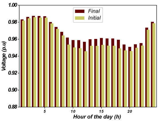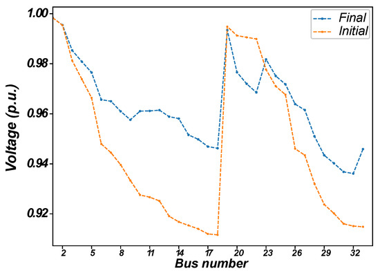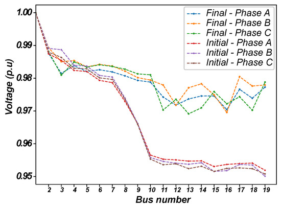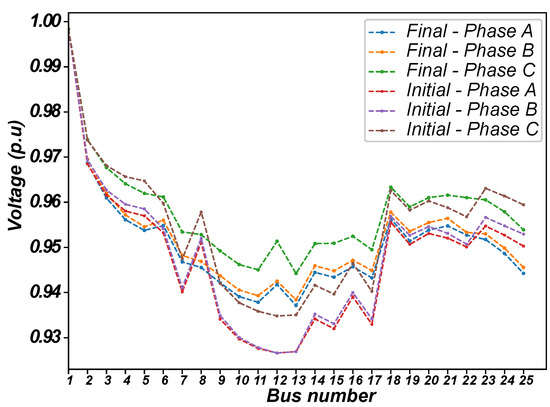 Initially considering a fixed demand and characteristics provided in Reference [47], the algorithm was tested in 100 runs and results are presented in Table 4. Figure 2 shows the voltage levels at each bus before and after the reconfiguration.