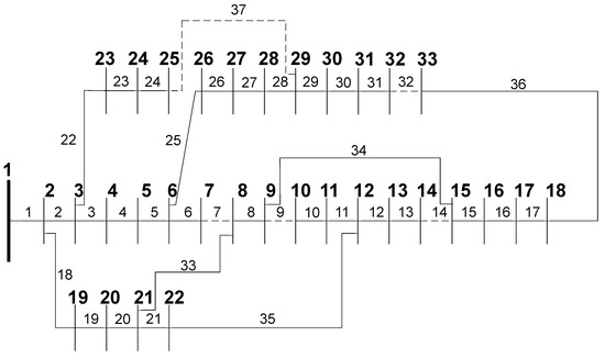 Firstly, a 33-bus and 37-branch balanced system was considered, presenting a base voltage of 12.66 kV. All system data are found in [47].