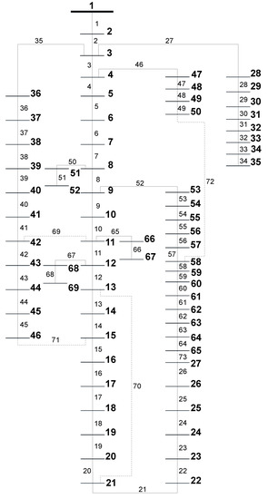 Regarding the search space, it is composed of fundamental loops (FL) that are established when considering the system as a meshed network. The total number of FL is also the same as , as one switch is chosen for each FL to compose the set of switches of the solution. For example, in the 33-bus and 37-branch system [47], , and, therefore, the system is composed of five FL and the solution of five switches. A detailed description of how this is performed can be found in [1].