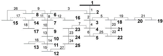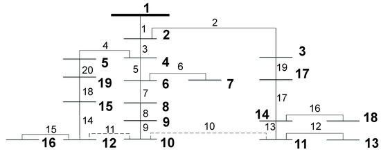 As distribution networks operate in a radial way, there must be no meshes in the system. This is assured by opening one different switch of each mesh (considering that all branches have one switch and have taken into consideration the sigmoid function of Section 3) and attending the constraints related to radiality presented in Section 2, as briefly presented in Section 3