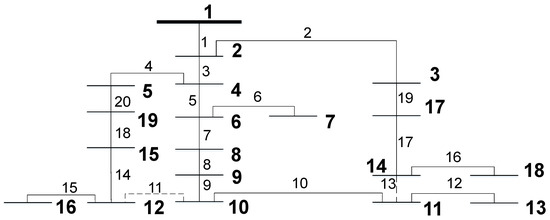 Hence, to solve the DNR problem using the SBAT, each particle position will represent a set of switches to be opened, where each position coordinate represents a switch selected from a given search space using Relation (19) as previously established. The number of coordinates of the bats’ positioning is the same as the number of open switches needed to maintain the system operating as a radial network, , inferred from Equation (7).