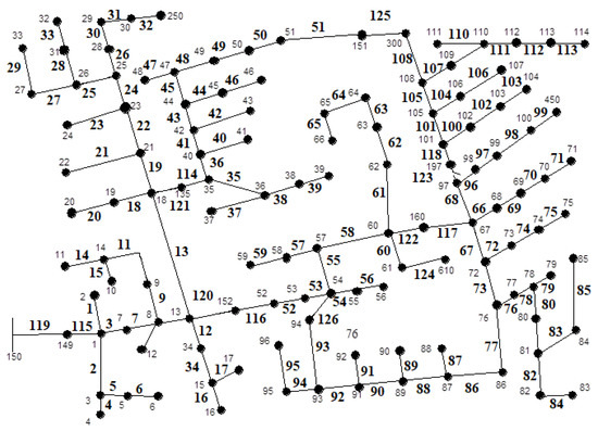 As for variable demand, the loads were divided as follows: residential (1, 2, 5, 6 to 9, 12, 19, 20, 28 to 30, 32 to 35, 37, 38, 42, 43, 45 to 50, 53, 55, 58, 59, 62, 65, 66, 73, 76, 83, 85 to 88, 90, 92, 94, 96, 100, 103, 104, 106, 107, 109, 111 to 113), commercial (4, 7, 17, 24, 52, 60, 63, 64, 70, 74, 79, 95, 98, 99) and industrial (16, 22, 31, 39, 41, 51, 56, 68, 69, 71, 75, 80, 82, 84, 102, 114). The algorithm indicates opening switches 125-93 with total losses costs of 95.6 USD as opposed to the initial set of open switches 125-126 with costs of 96.5 USD. The voltage levels, minimum and minimum–maximum, also improved, going from 0.928 p.u. to 0.931 p.u. at bus 114 phase A (20 h) and from 0.980 p.u. to 0.981 p.u. at bus 150 phase B (3 h).