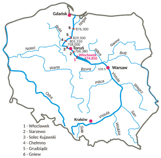 - Szydłowski, M.; Gąsiorowski, D.; Hakiel, J.; Zima, P.; Szymkiewicz, R. Analysis of the hydraulic effects of the Lower Vistula Cascade. Inżynieria Morska I Geotech. 2014, 5, 420–432. (In Polish) [Google Scholar]