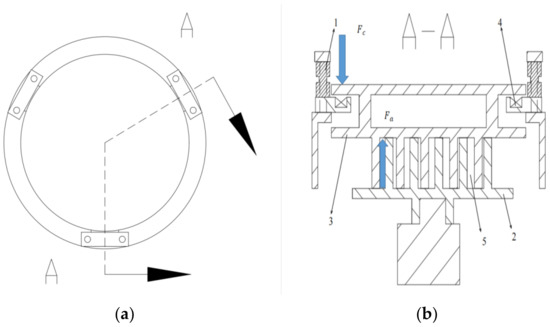 Schematic diagram of electromagnetic balance scheme for axial gas force of the scroll compressor: (a) the top view of the structure; (b) the sectional view from A-A direction; 1—pressure sensor; 2—moving vortex disk; 3—static vortex disk; 4—electromagnet; 5—compression chamber.